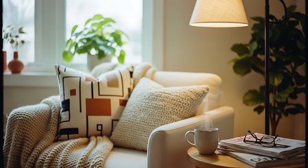 A serene living room scene featuring a beige couch with a knitted blanket, a wooden side table with a stack of books, a steaming white coffee cup, and a potted plant, bathed in warm sunlight.