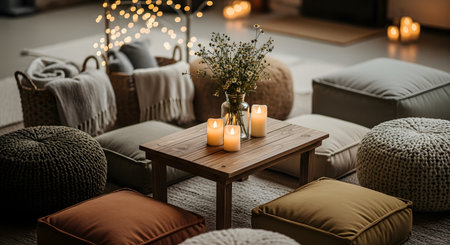 A serene living room with a comfortable sofa, wooden coffee table, lit candles, and a warm atmosphere, featuring a vase with flowers and a cup on the table.