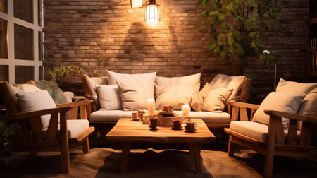 A chic cafe interior with modern wooden furniture, hanging pendant lights, and cozy cushions, softly lit by warm light.