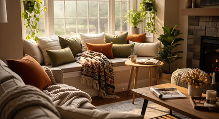 A serene corner is filled with plush pillows and a warm blanket draped over a comfortable seat. Soft afternoon light streams through large windows, creating a peaceful atmosphere.