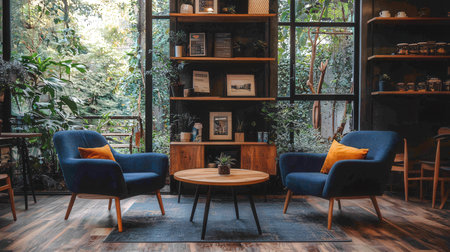 A cozy living room with modern decor, featuring large windows showcasing autumn foliage, stylish furniture, and decorative plants