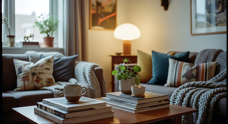 A warm, inviting living room with a coffee table holding books, a mug, and potted plants. Soft lighting, cushions, and blankets enhance the cozy atmosphere.