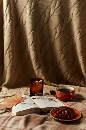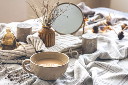 Cozy home weekend arrangement, warm bedroom decorations with coffee, wool blanket