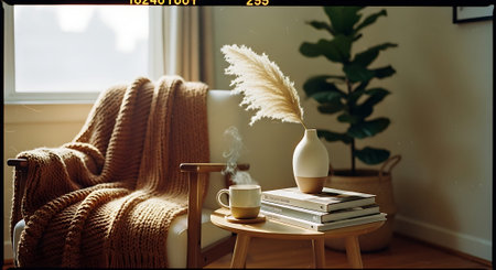 A warm living room featuring a brown armchair with a knitted blanket, a side table with books, a white vase with a feather, and a steaming cup of coffee.