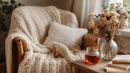 A cozy knitted blanket on armchair with dried flowers and tea cup creates warm cottagecore vibe in peaceful living room setting