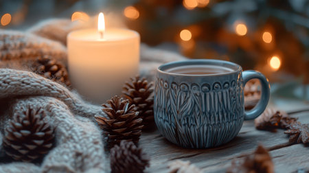 Cozy winter evening with a warm beverage, candlelight, and decorative pinecones