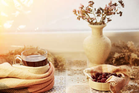 Cozy autumn home. Natural healthy calming drink with dogwood berry. Autumn healthy food. Pastel colors with copy space. Healthy organic food. Vitamin tea. High quality photo