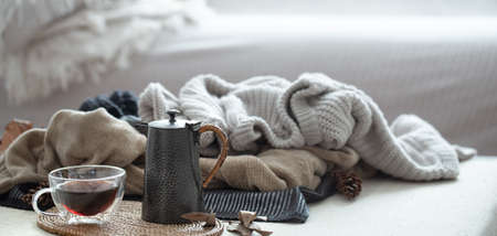 Glass cup of tea with a teapot on the background of warm clothes in cold colors. Autumn composition horizontal