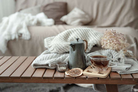 Cozy home still life with a cup of tea and details of autumn home decor in the interior of the room.