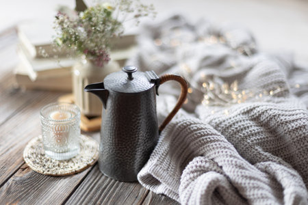 Home cozy still life with a candle and a teapot. Home coziness and comfort.
