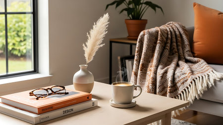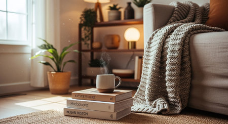 A serene living room scene featuring a beige couch with a knitted blanket, a wooden side table with a stack of books, a steaming white coffee cup, and a potted plant, bathed in warm sunlight.