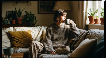 A cozy indoor scene featuring a person holding a steaming mug, sitting on a sofa with knitted sweater and warm socks, surrounded by books and a candle, with soft lighting and a window view