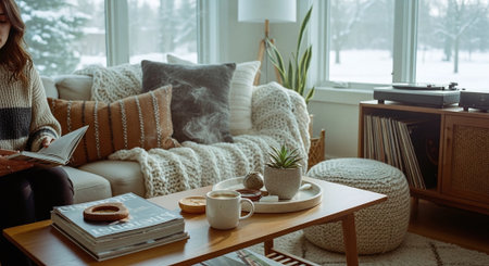 A cozy living room with a person holding a warm drink, wrapped in a chunky knit blanket on a sofa. a coffee table has candles, books, snacks, and a decorative branch in a vase nearby.