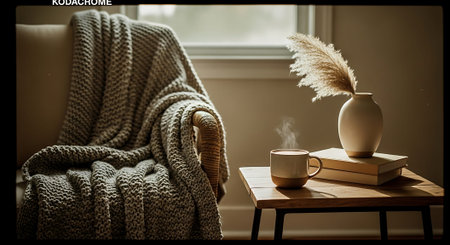 A cozy living room scene featuring a comfortable armchair draped with a knitted blanket, surrounded by decorative elements like candles, books, and plants, creating a warm and inviting atmosphere