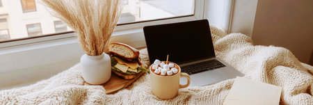 Cozy home interior with a laptop, a cup of coffee and a book on the windowsill