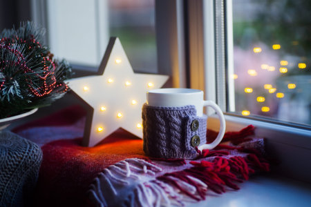 Knitted mug with tea on checkered plaid near window with LED white Christmas star on background. Festive New Year composition in daylight.