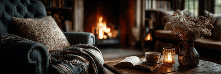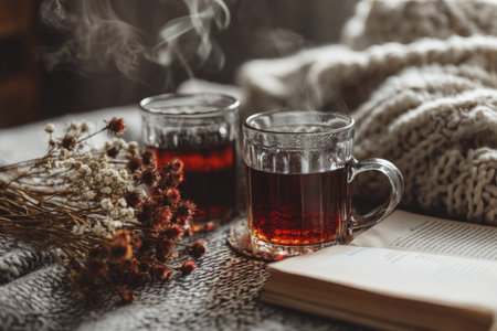 Warm and inviting home scene with herbal tea, cozy blanket, and a book for a winter mood