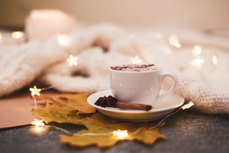Close up, macro. A cup of hot cappuccino, brown paper, knitted blanket, garland. Copy space.