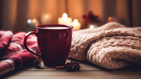 A red mug of warm beverage sits beside a soft knit sweater and plaid blanket, candles glowing softly in the background. Perfect winter scene.
