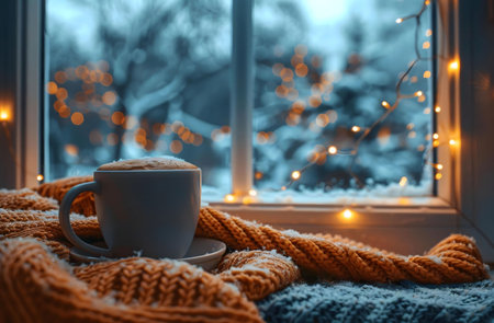 A warm drink sits on a knit scarf by a snowy window, illuminated by soft lights. Cozy winter scene.