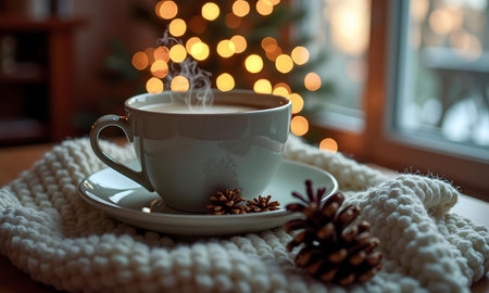 A steaming cup of coffee rests on a cozy knitted sweater near a window, with a blurry Christmas tree in the background, evoking warmth and holiday spirit.