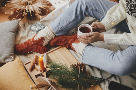 Woman holding a cup of tea by the Christmas fireplace. Woman relaxes by warm fire with a cup of hot drink and warming up her feet in woollen socks. Close up on feet. Winter, Christmas holidays concept