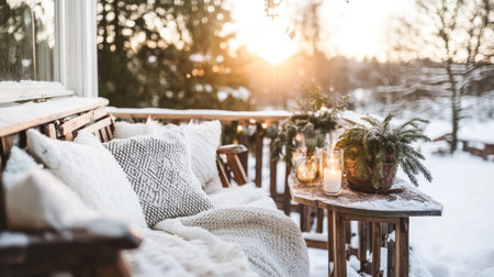 A cozy Scandinavian balcony with white cushions, wooden furniture, and soft blankets for the winter. The sun is setting over the snowy landscape, casting a warm light on the space and creating an inviting atmosphere for relaxation or social gatherings. A small table holds candles, and potted plants add greenery to the scene. --chaos 30 --ar 16:9 --v 6.1 Job ID: 584eef99-d730-4f47-a079-0a48bb950585