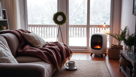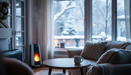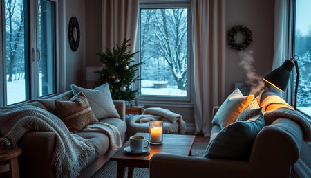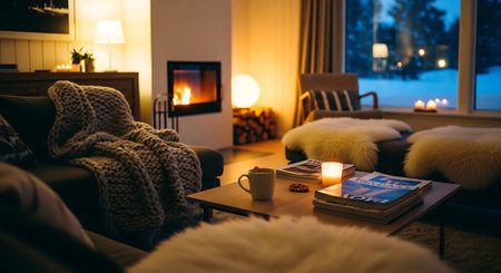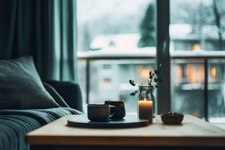 Imagine a serene Scandinavian living room that beautifully showcases a cozy ambiance, complete with a warm cup of tea, flickering candlelight, and a stunning snowy view just outside the window