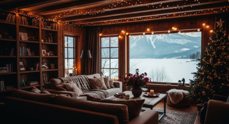 A warm and inviting living room features a large window offering a breathtaking view of snow-capped mountains. The room is decorated with string lights, a Christmas tree, and a comfortable sofa. Bookshelves filled with books add to the cozy atmosphere, while a lamp provides soft lighting.