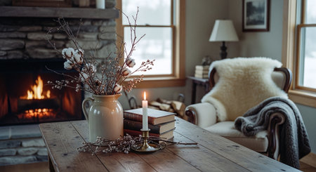 A person is enjoying a warm and cozy winter evening, reading a book by the fireplace. The room is softly lit with candles and a lamp, creating a serene and inviting atmosphere.