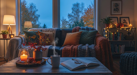 Cozy living room with a book, a cup of tea, a candle and a sofa in the evening