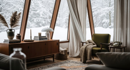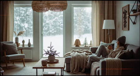 A cozy living room with large windows showing a snowy landscape outside, a woman sitting on a sofa with a cup in hand, warm lighting, and decorative plants