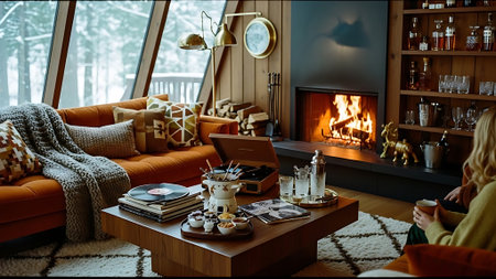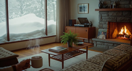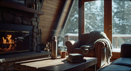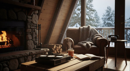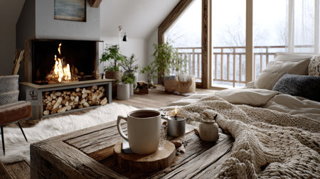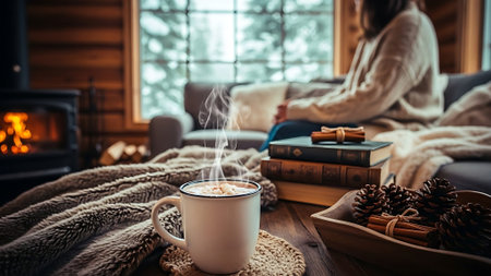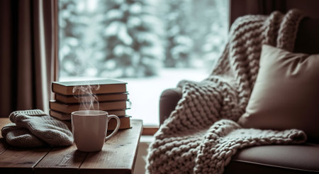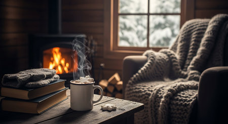 A cozy living room with a fireplace, a steaming cup of hot chocolate on a wooden table, books stacked nearby, and a view of snowy trees outside