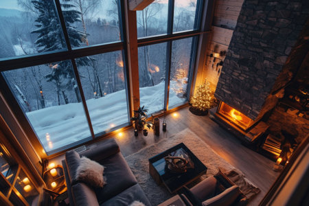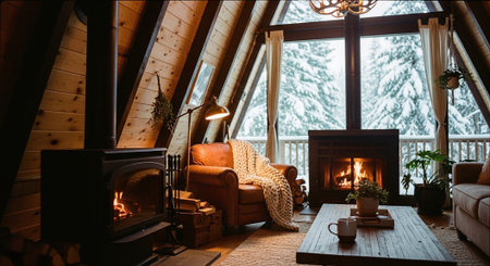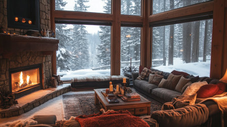 A cozy wooden cabin interior with a fireplace, wide window and snowy wide landscape outside. AI generative