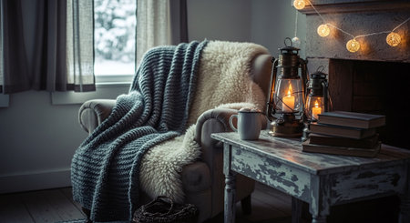 A cozy living room scene featuring a comfortable armchair draped with a soft blanket, a rustic table with books and a mug, and warm lanterns glowing softly