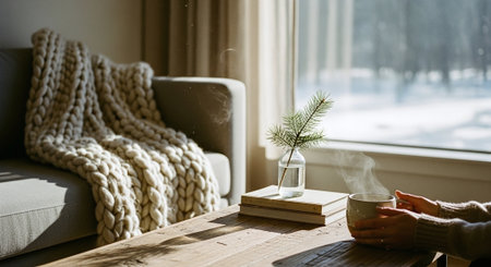 A cozy living room scene featuring a knitted blanket on a sofa, a wooden coffee table with a steaming cup, and a small vase with a pine sprig, sunlight streaming through a window