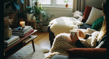 A cozy living room scene with a person wrapped in a chunky knit blanket, holding a mug, surrounded by plants and books, soft lighting, warm atmosphere