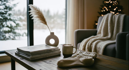 A cozy living room scene featuring a coffee cup on a wooden table, magazines stacked, warm socks, and a decorative vase with pampas grass, snow visible outside the window