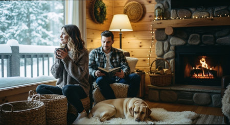 A cozy winter scene featuring a woman sitting by a window with a mug, a man reading a book, and a dog lying on the floor in a warm cabin setting