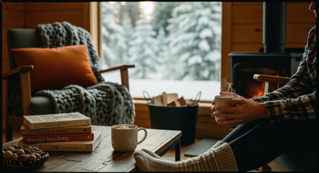 A cozy winter scene featuring a person holding a warm drink, sitting in a rustic cabin with a wood stove, snow-covered trees visible through the window, and a stack of books on the table