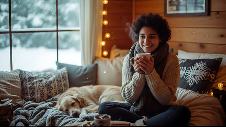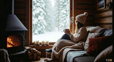 A cozy indoor scene featuring a woman sitting by a window with a cup, wearing a knitted hat and sweater, surrounded by winter decor, snow visible outside