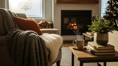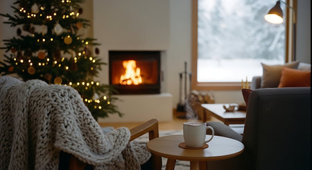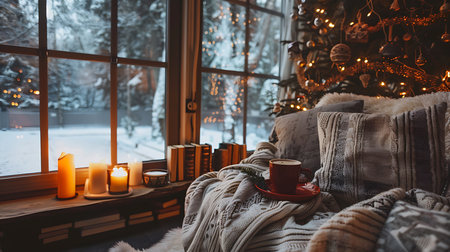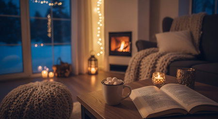 Cozy living room with a cup of hot cocoa, book, knitted plaid, candles and Christmas decorations.