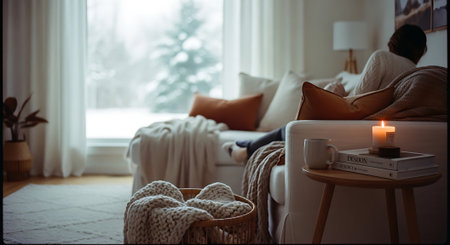 A cozy living room with a person holding a warm drink, wrapped in a chunky knit blanket on a sofa. a coffee table has candles, books, snacks, and a decorative branch in a vase nearby.