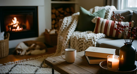 Cozy living room with fireplace, coffee cup and books. Winter season.