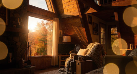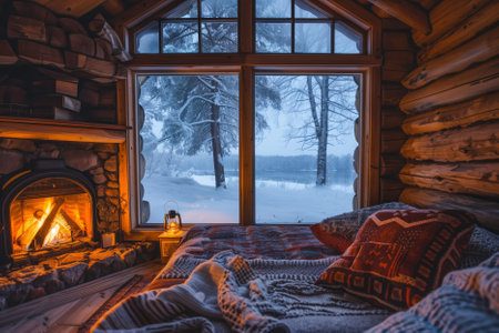 Cozy winter interior with a view of a serene lake at sunset, featuring soft lighting, plush seating, and festive decorations to create a warm, inviting atmosphere. High quality photo