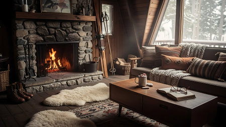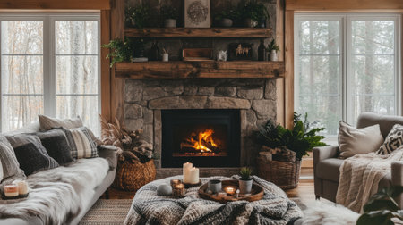 This inviting cabin interior showcases a warm fireplace, cozy sofa, and natural decor, creating a perfect retreat for relaxation during winter days.