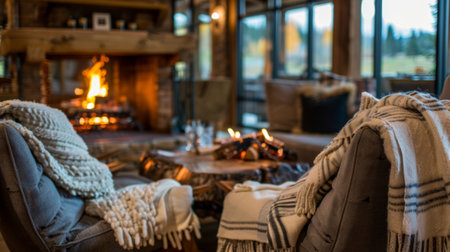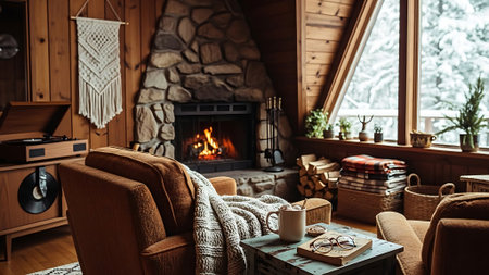 Experience cozy winter scene with fireplace and armchair blanket. Indulge comfort and warmth in rustic home while relaxing indoors. Embrace inviting atmosphere for quiet leisure time. AI Generative AI generated