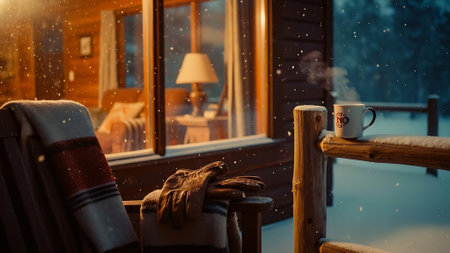 A cozy winter scene featuring a person holding a steaming mug in a rustic cabin, surrounded by books, a small Christmas tree, and warm lights, with snow visible outside the window