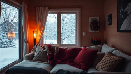 This inviting winter retreat features soft cushions and warm blankets, offering a perfect space to relax and enjoy the serene snowy landscape outside.