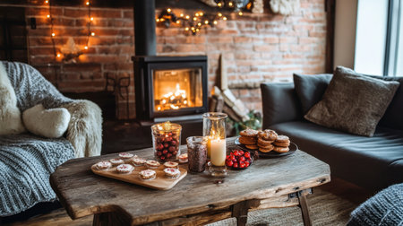 A cozy rustic living room featuring a warm fireplace and a beautifully arranged table with holiday treats, creating an inviting atmosphere for winter gatherings.